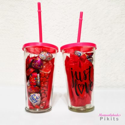 Vaso de vidrio con popote y letrero de día del amor con chocolate y cono de dulces con gomas, idal para el agua en la oficina